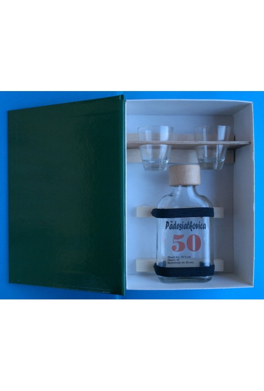Orginálny darček k 50. Obal je v tvare knihy. Obsah: 2x- poháriček- štamperlíček 1x - fľaštička, kde odporúčame doliať alkohol obľúbenej značky