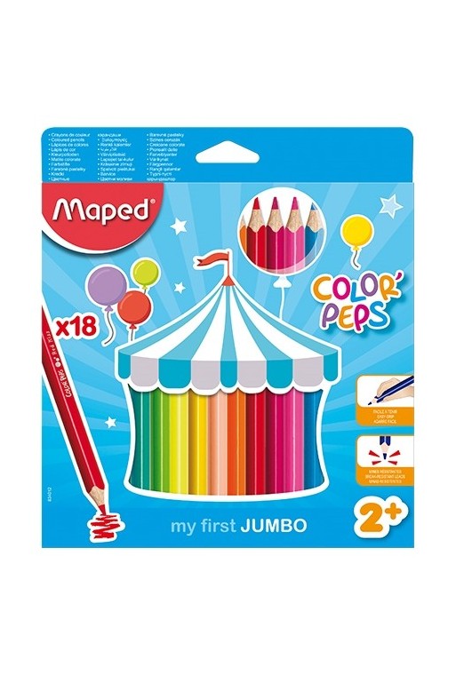 Pastelky Maped Color´Peps JUMBO určené vďaka hrubému telu aj pre tých najmenších. • trojhranné telo pre pohodlný úchop • jasné a sýte farby • odolné jadro pastelky • hrúbka tuhy: 4.7 mm • 18 pasteliek v balení • trojhranné pastelky pohodlne ostrúhate klasickým strúhadlom