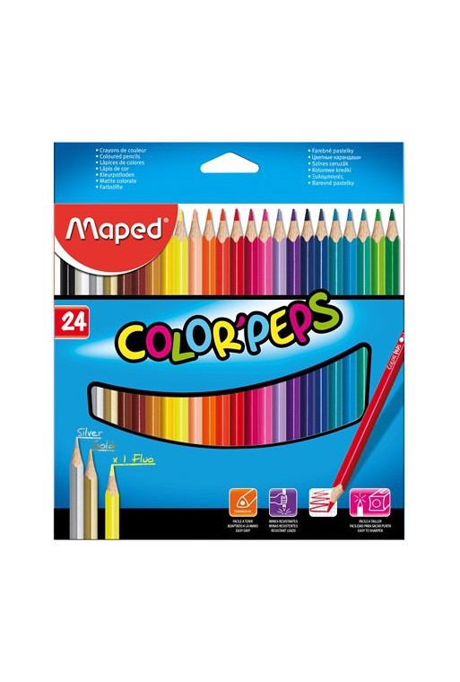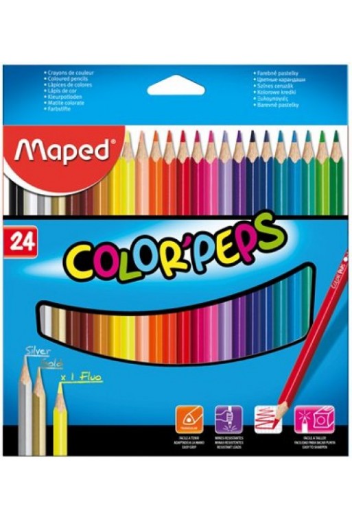 Maped farebné pastelky,ktoré vyhovujú rozmanitým potrebám detí. Mäkké a odolné tuhy, ľahko sa ostria, neštiepia sa. Trojuholníkový tvar pre lepšie uchopenie, ľahšie a pohodlnejšie používanie, 24 kusov.