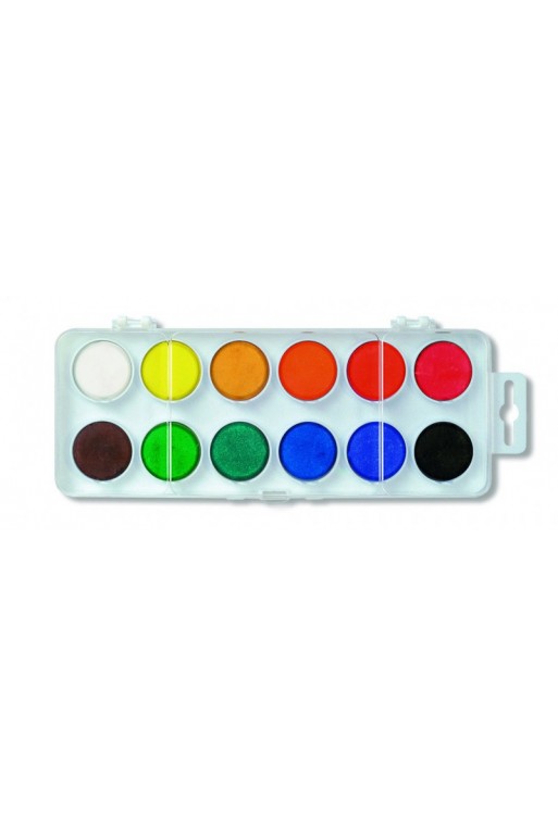 Vodové farby KOH-I-NOOR v plastovom obale, počet farieb 12 ks, priemer farieb 30 mm. Sú určené na maľovanie na papier a iné savé materiály, riediteľné vodou