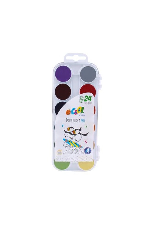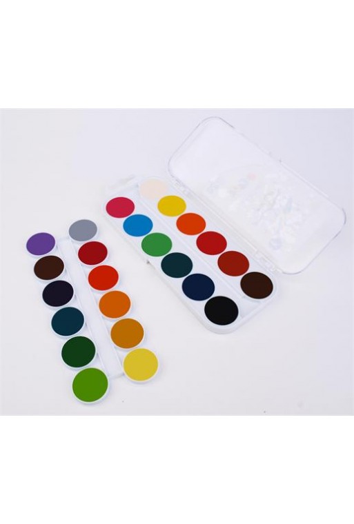 12-farebná sada netoxických vodových farieb, dodávaná v okrúhlom plastovom boxe s uzatváraním na závit. Priemer tablety 22,5 mm, vodou riediteľné, vhodné na papier a iné savé materiály, dve vrstvy po 6 tabliet, t.j. 12 odtieňov farieb: žltá citrónová, oker svetlý, oranž., rumelka červená sv., karmínová, ultramarín sv., modrá kobalt, zelená sv., zelená tm., siena pálená, umbra pálená, čierna.