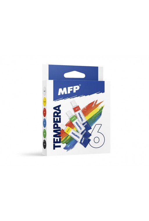 Súprava temperových farieb. Temperové farby sú balené po 6 základných farbách v papierovej škatuľke. Balenie obsahuje modrú, zelenú, žltú, červenú, bielu a čiernu farbu. Tieto farby neobsahujú žiadne toxické látky. Tieto farby sa vyznačujú vysokými krycími vlastnosťami a kvalitou, neobsahujú žiadne toxické látky. Sú ideálne pre školské i hobby použitie.Obsah farby v jednej tube: 12 mlRozmery balenia: 100x115x20 mm