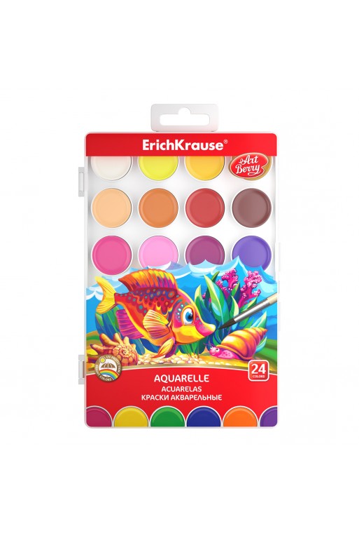 Vodové farby sú určené na maľovanie na papier a iné savé materiály, riediteľné vodou. Tableta obsahuje 12 farieb o priemere 2,3 cm. Súčasťou balenia je i štetec. Rozmer: 8x18 cm.