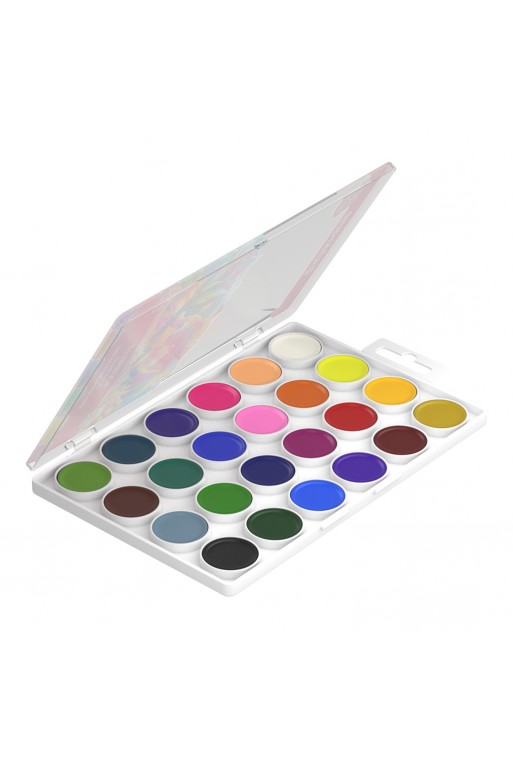 12-farebná sada netoxických vodových farieb, dodávaná v okrúhlom plastovom boxe s uzatváraním na závit. Priemer tablety 22,5 mm, vodou riediteľné, vhodné na papier a iné savé materiály, dve vrstvy po 6 tabliet, t.j. 12 odtieňov farieb: žltá citrónová, oker svetlý, oranž., rumelka červená sv., karmínová, ultramarín sv., modrá kobalt, zelená sv., zelená tm., siena pálená, umbra pálená, čierna.