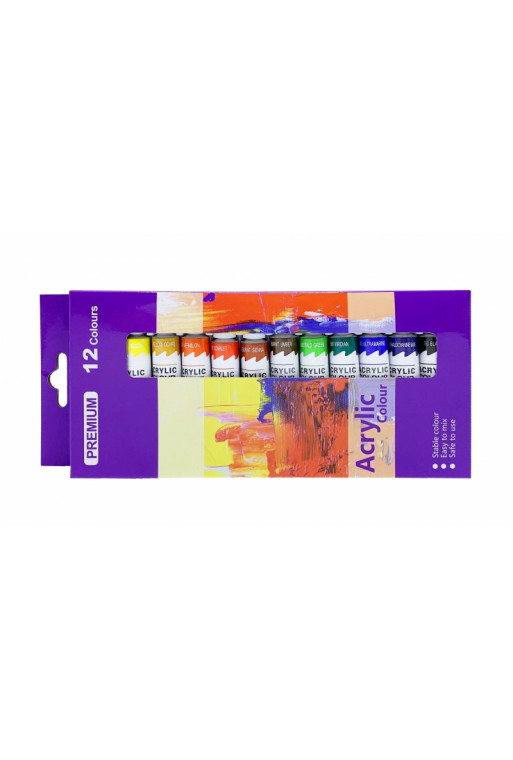 Akrylové farby v jasných odtieňoch, riediteľné vodou, s dobrou krycou schopnosťou. Farby možno aplikovať na všetky bežné podklady ako je papier, lepenka, plátno. Sada obsahuje 12 farebných odtieňov v tubách o objeme 12ml, uložených v papierovej krabičke. Kvalitné, cenovo dostupné farby.