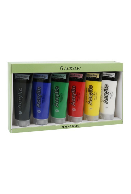 Akrylové farby 6x 75ml možno aplikovať na všetky bežné podklady ako je papier, lepenka/doska alebo plátno. Farby sú rýchloschnúce a vláčne. Môžu byť použité priamym vytlačením z tuby alebo riedené vodou. Balenie obsahuje 6 farieb o objeme 75 ml. Sada obsahuje farby: čierna, modrá, zelená, červená, žltá a biela.