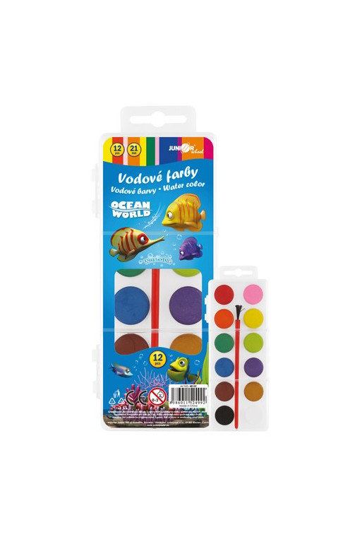 Vodové farby sú určené na maľovanie na papier a iné savé materiály, riediteľné vodou. Tableta obsahuje 12 farieb o priemere 2,3 cm. Súčasťou balenia je i štetec. Rozmer: 8x18 cm.