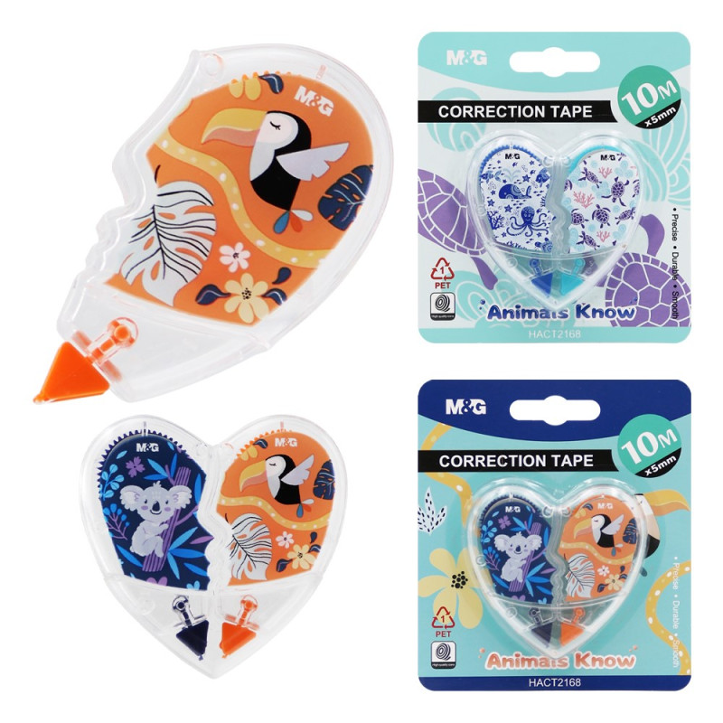 Korekčný strojček s aplikačným hrotom, umožňujúcim pohodlné a čisté nanášanie suchého korekčného filmu s motívom zvieratiek. Korektory svojim tvarom zapadajú do seba a tvoria tak tvar srdca. Šírka pásky 5 mm, návin 10 m. Dodávaný na blistri 2 ks