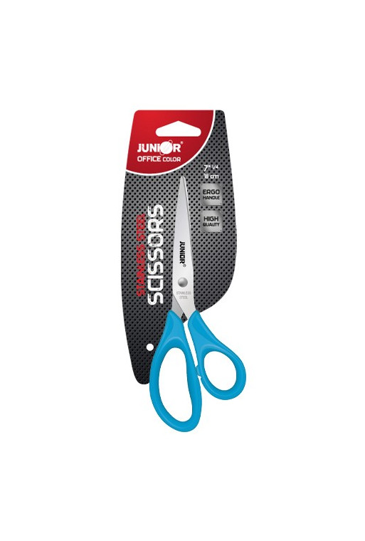 Nožnice s asymetrickými rukoväťami z PVC v kombinácii so silikónom poskytujúce komfortné uchopenie. Dĺžka nožníc 16,5 cm, dodávané v čierno-červenej farebnej kombinácii, na blistri. Rozmer: 165x65 mm, 68 mm čepeľ.