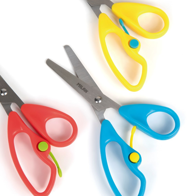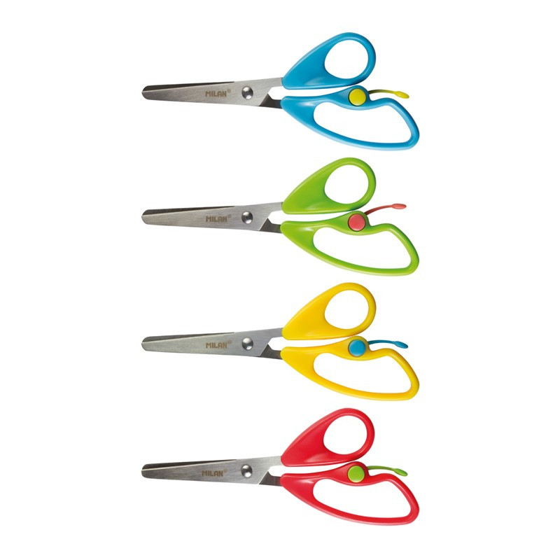 Ergonomické nožnice s plastovou rukoväťou v tvare motýľa. Dĺžka 14,4 cm s tlmičom, ktorý umožňuje "otvorenie" nožníc a zabraňuje priškripnutiu prsta dieťaťa. S čepeľou z nehrdzavejúcej ocele so zaoblenou špičkou. Ideálne pre využitie v škole.