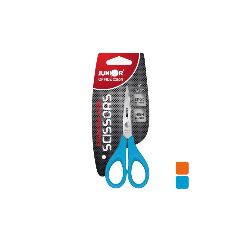Detské nožnice s merítkom na čepeli, dĺžka nožníc 13 cm, s rukoväťami z PVC, dodávané na blistri, v modrej a oranžovej a zelenej farbe. Rozmer: 130x55mm, 40mm čepeľ.