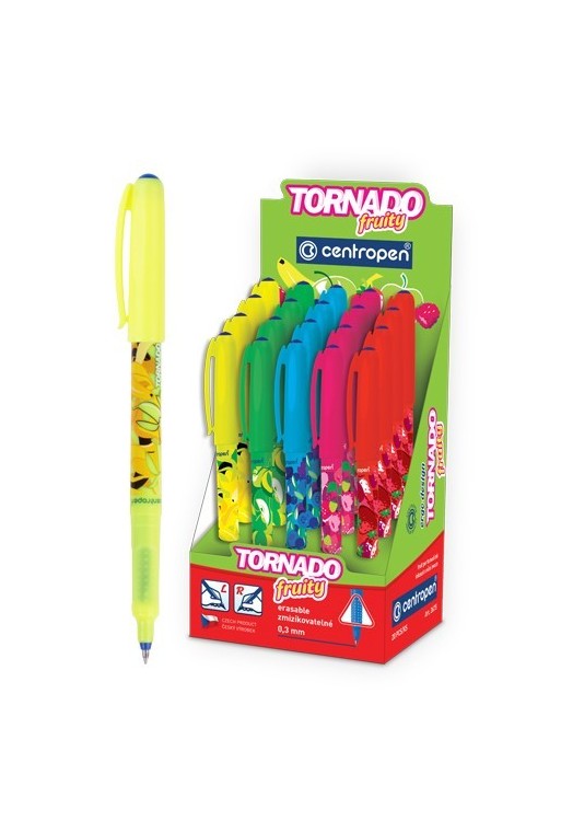 Obľúbené guľôčkové pero Tornado s trojuholníkovou úchopovou časťou s masážnymi bodmi, s tenkou rovnomernou stopou šírky 0.3 mm, ktorá sa dá vyzmizíkovať, atramentová náplň modrej farby - parfumovaný atrament (banán, jablko, jahoda, malina, čučoriedka). Pero je určene pre pravákov, ľavákov i dysgrafikov.