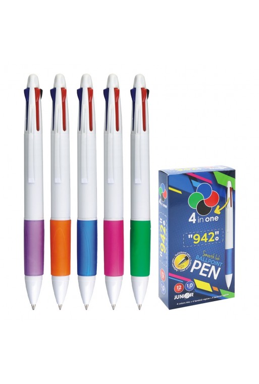 Štvorfarebné guľôčkové pero s klipom, šírka stopy 1,0mm. Farba náplne: čierna, červená, zelená, modrá. Pohodlné držanie vďaka pogumovanému farebnému gripu.