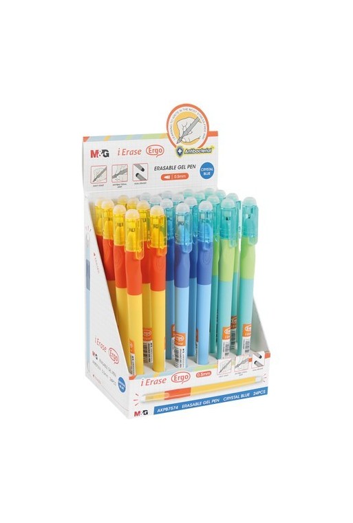 Gélový prepisovateľný roller so špeciálnou náplňou, vďaka ktorej je možné písaný text vymazať pomocou plastového zakončenia pera a znovu prepisovať. Roller gumovací M&G iErase - ergonomický úchop, umožňuje stabilné držanie pera. Vhodné pre pravákov a ľavákov. V 3 farebných dizajnoch, prepisovateľný. Šírka stopy - 0,5 mm.