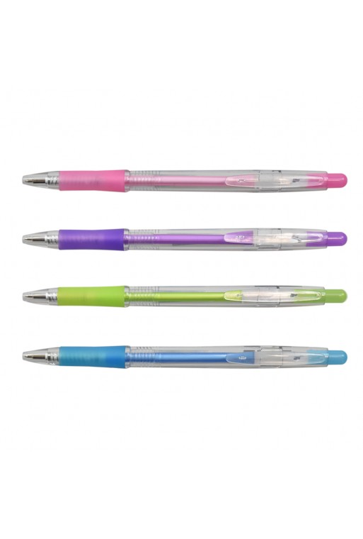 0911416660Guľôčkové plastové klikacie pero s gumeným úchopom. Šírka stopy písma 0,5 mm. Farba náplne modrá. V ponuke mix farieb.