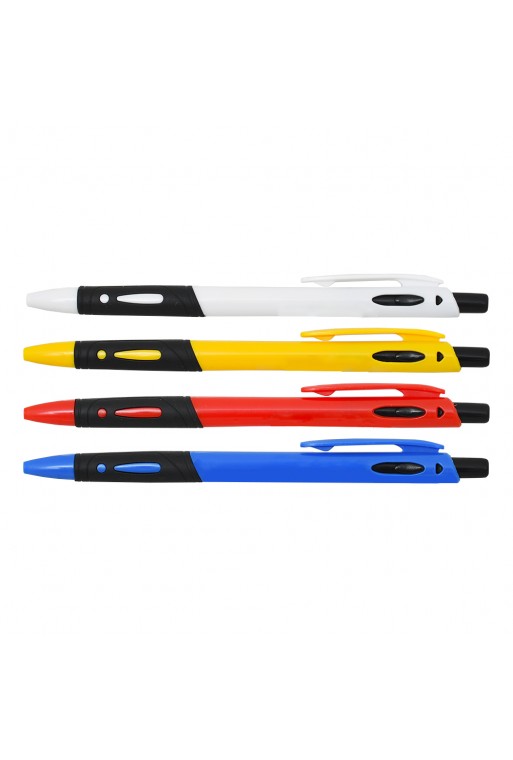 Guľôčkové plastové klikacie pero s gumeným úchopom. Šírka stopy písma 0,5 mm. Farba náplne modrá. V ponuke mix farieb.