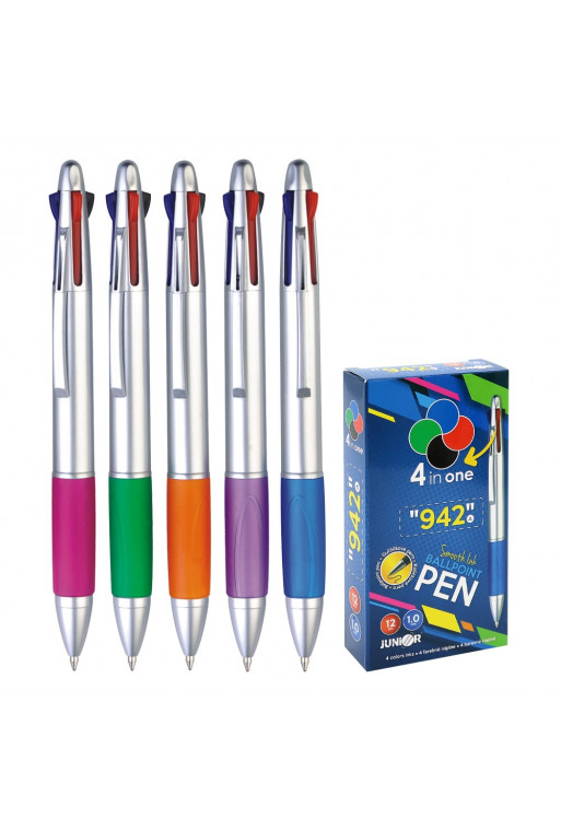 Štvorfarebné guľôčkové pero s klipom, šírka stopy 1,0 mm. Farba náplne: čierna, červená, zelená, modrá. Pohodlné držanie vďaka pogumovanému farebnému gripu. Telo pera plast - metalický vzhľad. V ponuke 4 farebné varianty gripu.