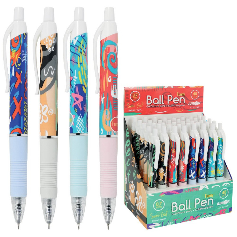 0911416660Guľôčkové pero Funny (4 dizajny),priemer guľôčky (hrot) 0,7 mm,modrý atrament Semi-Gel,stláčací mechanizmus, gumový, profilovaný úchop pre pohodlné držanie pera pri písaní