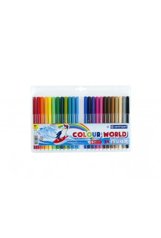 24-kusová súprava farebných popisovačov s vyprateľnými atramentmi pri 60°C; popisovače odolávajú vyschnutiu minimálne 5 rokov, šírka stopy 1mm, valcový hrot priemeru 2mm je odolný vôči zatlačeniu, s ventilačným uzáverom. Sada balená v plastovom obale.
