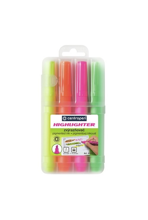 Celofluorescenčný zvýrazňovač s reflexným atramentom, vhodným na písanie na všetky druhy papiera, vrátane faxového a samokopírovacieho. Klinový hrot, šírka stopy 1–4 mm, 4 fluorescenčné farby, ventilačný uzáver.