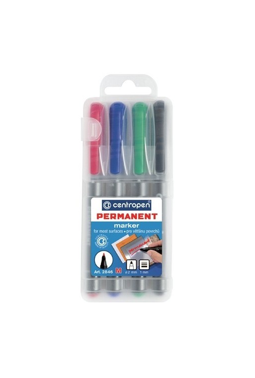 Permanentný popisovač na alkoholovej báze píše na väčšinu povrchov. Odolá vode, oteru, poveternostným vplyvom. Valcový hrot so šírkou stopy 1 mm. Vyrobené z 53 % recyklovaného materiálu .Šírka stopy1 mm Farba atramentu červená, čierna, modrá, zelená Typ hrotu valcový Priemer hrotu 2 mm VýrobcaCENTROPEN 4 ks, 158x63x24 mm