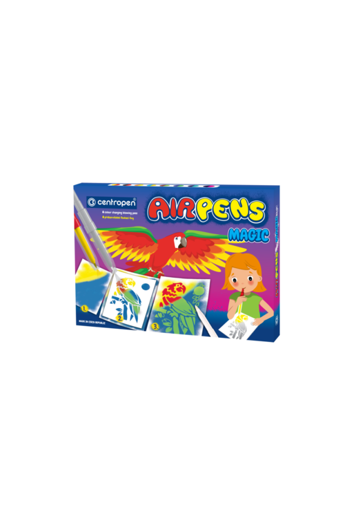 Kreatívna sada, ktorá obsahuje 8 fúkacích magických fixiek, 3 zmizíky, 6 šablón a 10 listov papiera A4.