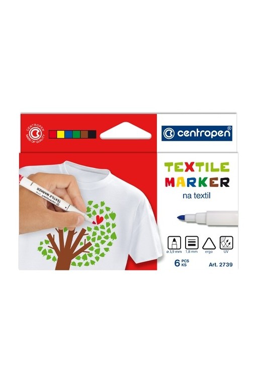 Popisovač - sada 6 ks na textílie s okrúhlym hrotom a ergo držaním. Bez nutnosti zažehlenia. Zdraviu neškodlivý atrament, svetlostály. Farby sú odolné voči praniu do 60 °C. Šírka stopy 1,8 mm.