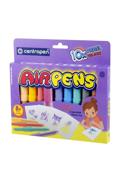 10-kusová sada fúkacích popisovačov, vhodných na papier. Fixy sú plnené zadravotne nezávadným atramentom. Ľahko umývateľné a vyprateľné. Sada obsahuje 10 pastelových odtieňov a 8 ks šablón.