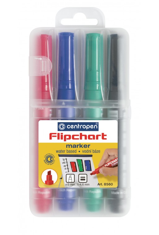 Popisovač na vodnej báze určený na písanie na tabule flipchart. Po napísaní na papier farba nepresiakne na druhú stranu papiera. Klinový hrot. Šírka stopy 1-4,6 mm. Väčšie balenie obsahuje 10 kusov. Cena je uvedená za 4-kusovú sadu.