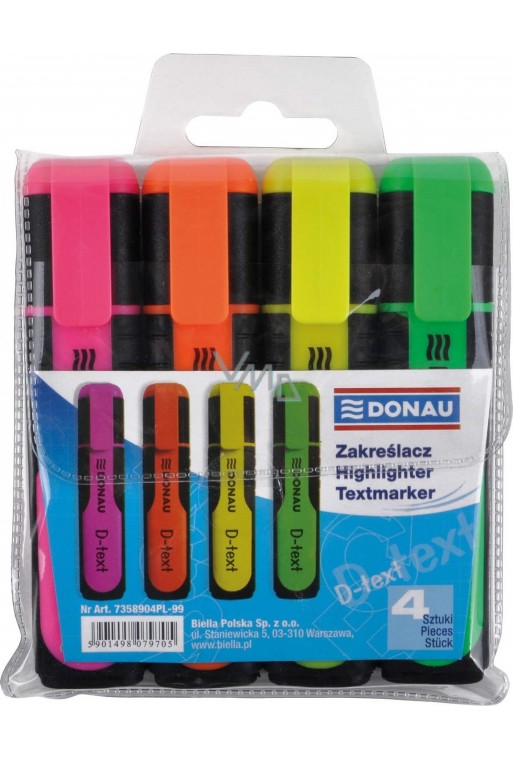 Zvýrazňovač osadený klinovým hrotom so šírkou stopy 1 - 3 mm. Plnený fluorescenčným atramentom, vhodným na všetky druhy papiera, vrátane kopírovacieho a faxového. Cena je uvedená za 4-kusovú sadu.