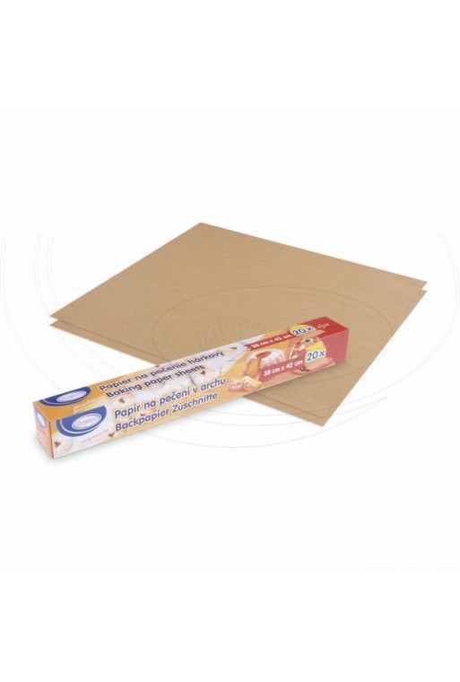Papier na pečenie obojstranne impregnovaný silikónom v hnedej farbe.Neoceniteľný pomocník všade tam, kde sa používa rúra na pečenie. Zabezpečí, aby sa váš pokrm nikde počas pečenia neprilepil. Papier sa používa v domácnostiach, gastro-sektore, v cukrárňach, závodných kuchyniach. Môžete na ňom piecť svoje obľúbené dobroty až do 220 stupňov Celzia. Rozmer: 38 x 42 cm Balenie: 20 ks