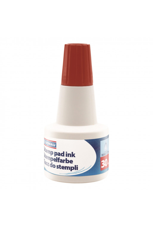 Pečiatková farba vodová červená 30ml s intenzívnou neblednúcou farbou pre gumové a polymérove pečiatky. Po zaschnutí sa tuš nerozpúšťa vo vode. Špička na fľaši umožňuje napúšťanie podušiek.