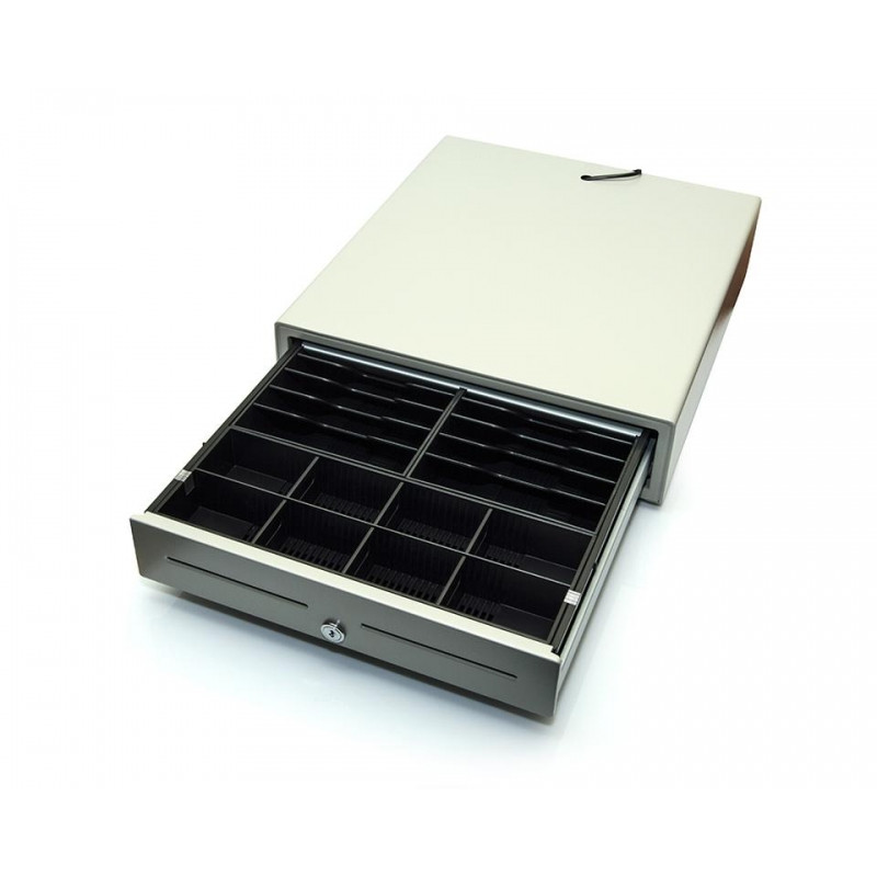Pokladničná zásuvka s elektrickým ovládaním a otváraním na kľúč. Vnútro zásuvky obsahuje priečinky pre 8 mincí a 4 bankovky.