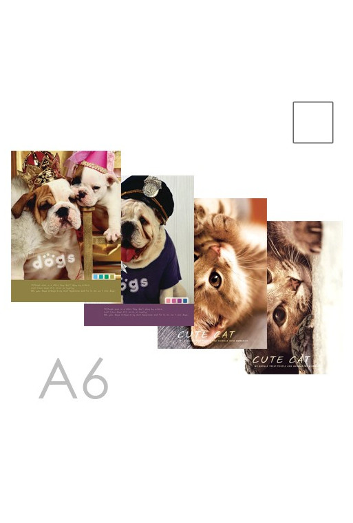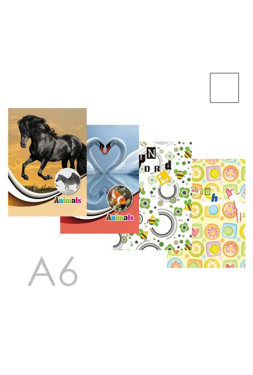 Zošit vo formáte A6 z kvalitného bezdrevného písacieho papiera je zvlášť vhodný na písanie poznámok, má 96 listov. Obal zošita je vyrobený z tvrdého kartónu, ktorý je potlačený rôznymi farebnými motívmi. Bez možnosti výberu motívu.
